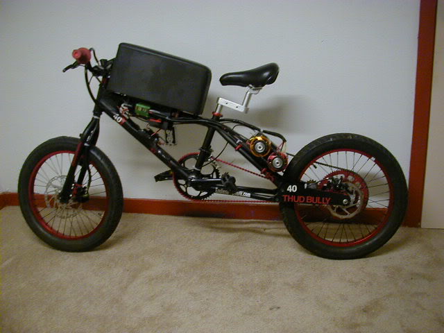 De acuerdo con Thud, la siguiente bici iría a 104 km/h si estuviera engranada. Sin embargo Thud no cree demasiado en trucos de velocidad y en su lugar se centra en el rendimiento en las curvas de los circuitos. Thud es bien conocido en la comunidad por hacer algunas de las bicicletas eléctricas de carrera más rápidas, ligeras y más seguras que jamás se hayan creado. Él se ha ganado su participación en las carreras de bicicletas eléctricas, y ha quemado cronómetros con bicicletas de gasolina también. Debajo está una rara combinación de dos velocidades de mediana potencia. Thud es un maquinista, y cuando no pudo encontrar una transmisión de 2 velocidades que fuera lo suficientemente fuerte y ligera que él quería, ¡creó una de la chatarra! Thud construyó la bicicleta fotografiada para un amigo, para que compitiera con ella en el Willow Springs Race contra motores de gasolina y bicicletas a pedal: